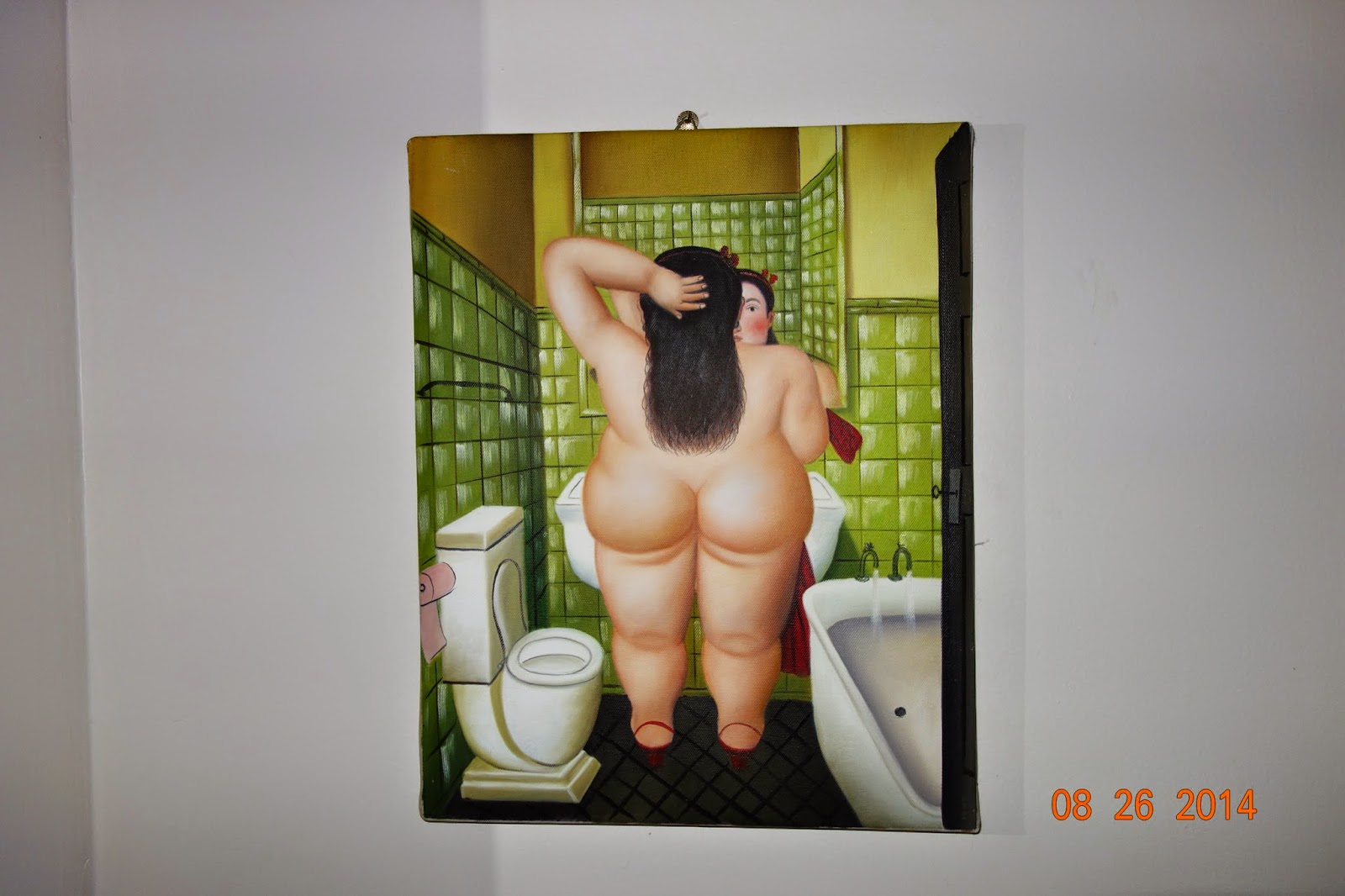 Here are pictures of a few things around the house that make me smile, including two vintage ceramic frog bowls, two Botero reproductions, an antique oil lamp, and there's my cat again.